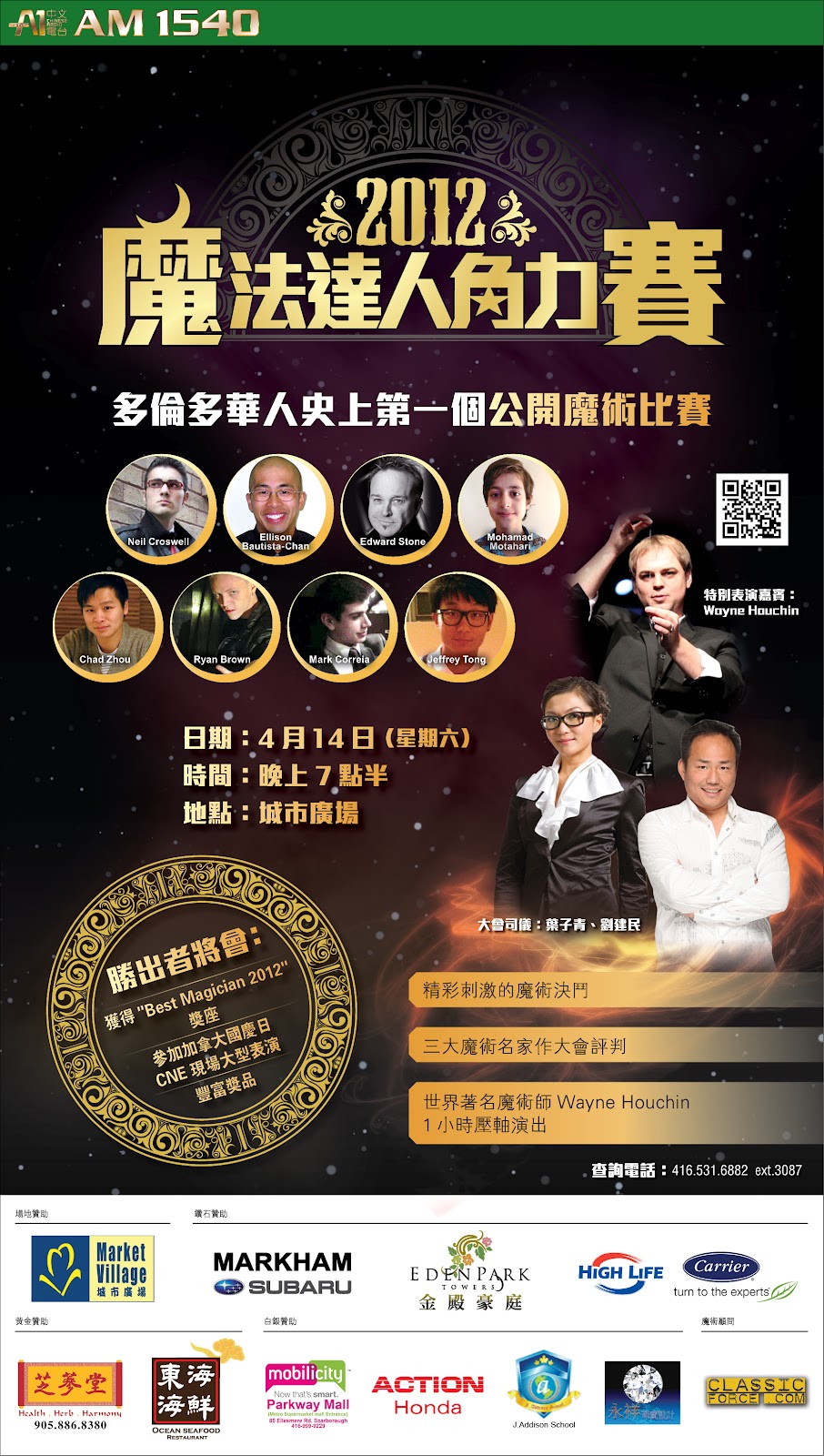 t@XT Sdp1h0E}7= UhK,H 由加拿大A1中文電台 (http://www.ccue.com/a1_radio/web/) 主辦、多倫多華人魔術團 “Classic Force” 協辦之 “魔術達人” 正式隆重登場。今次賽事是多倫多首次舉行,並破天荒將魔幻舞台定於Market Village 進行魔術競技比賽。本賽事將會是本地多倫多魔術愛好者與職業魔術師之間的生死搏鬥,以 “最強魔術師” 作名譽之戰。 \ua.%| 介事將有世界著名魔術師、前美國魔幻魔術師Criss Angel技術顧問 --- Mr. Wayne Houchin作為今次賽事的表演嘉賓。 S}X:LHr* v<1;1m 想一睹這位大師的風采嗎?想親身感受一下何為 “群魔大戰” 嗎?還等甚麼,立即來參加吧!